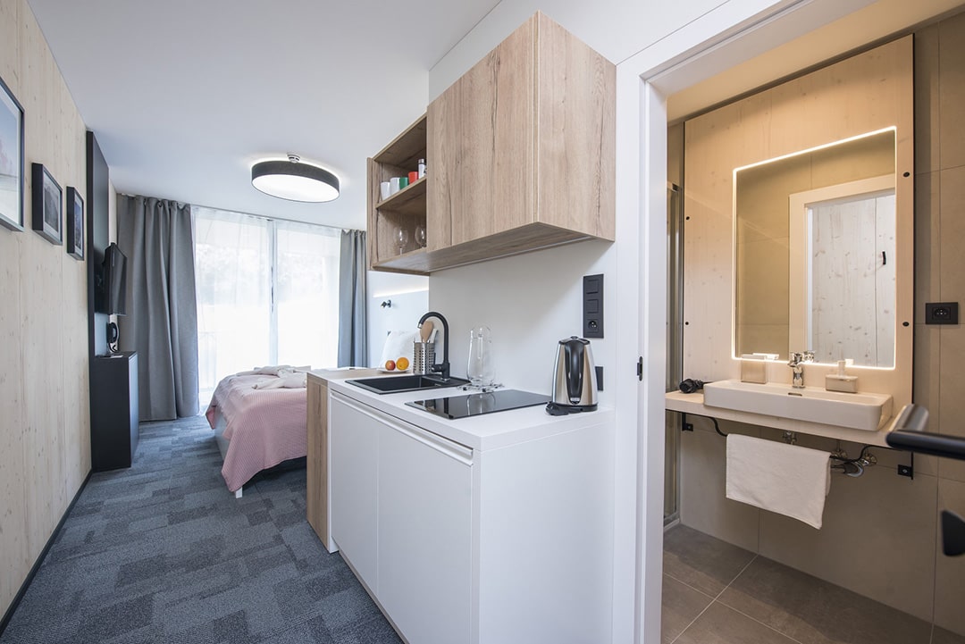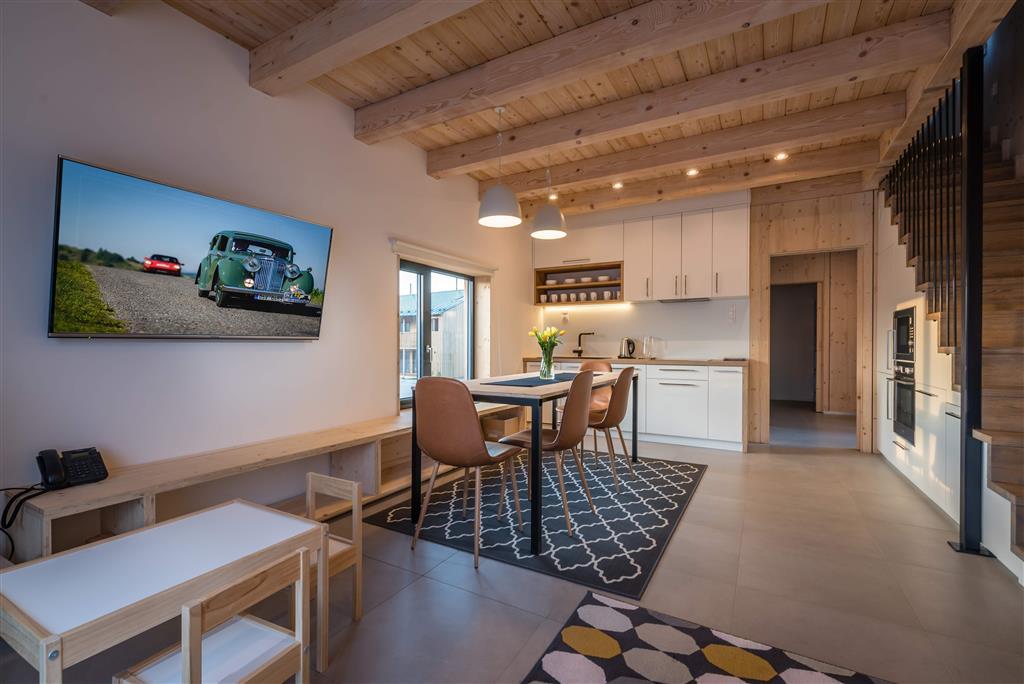 • a ubytovaní budeme v krásnych apartmánikoch s farebnými prvkami v škandinávskom štýle a s drevom po 2 ľuďoch. Apartmán ponúka okrem kúpeľne s toaletou a sprchovým kútom aj kuchynský kútik, ideálny na prípravu nenáročných raňajok alebo malého občerstvenia kto by chcel riešiť stravu vo svojej réžií. Napokon vojdete do priestrannej miestnosti so stolíkom, stoličkami, káblovou televíziou a mäkkou manželskou posteľou. Každá kuchynka má rýchlovarnú kanvicu, mikrovlnnú rúru, indukčnú varnú dosku, hrnce, panvice, dosku na krájanie, strúhadlo, hrnce, naberačky, lyžice, nože. Tiež sadu tanierov a príborov, sadu pohárov, šálky. Prostriedok na umývanie riadu, utierka na riad, hubka na riad. Tiež soľ, cukor, čierne korenie. V každom byte je k dispozícii aj chladnička.